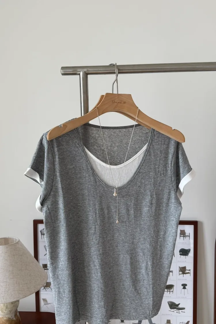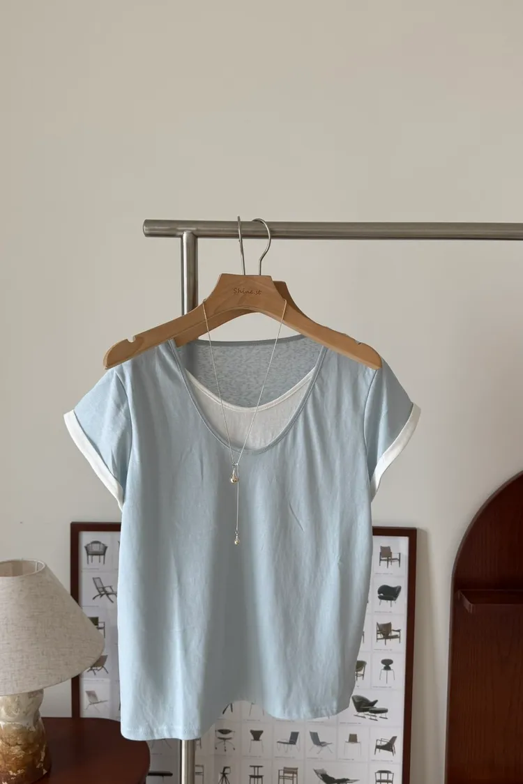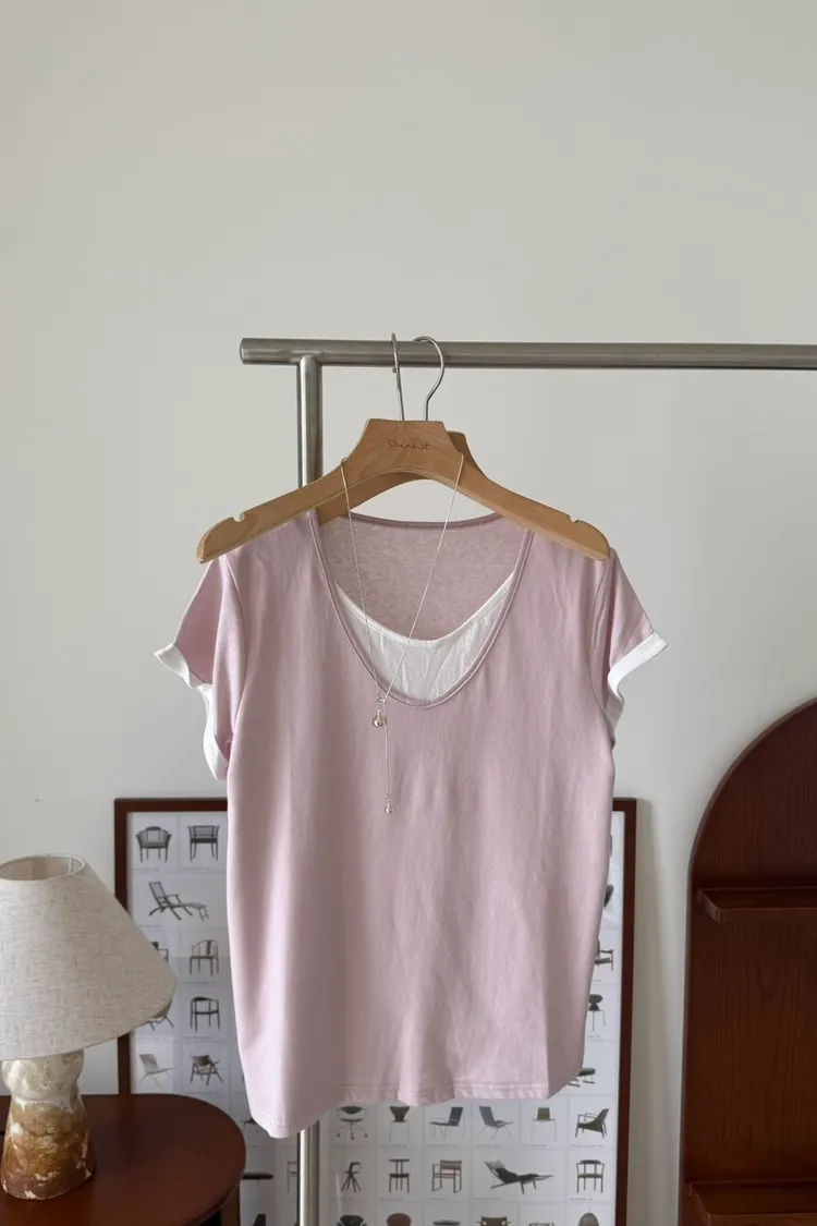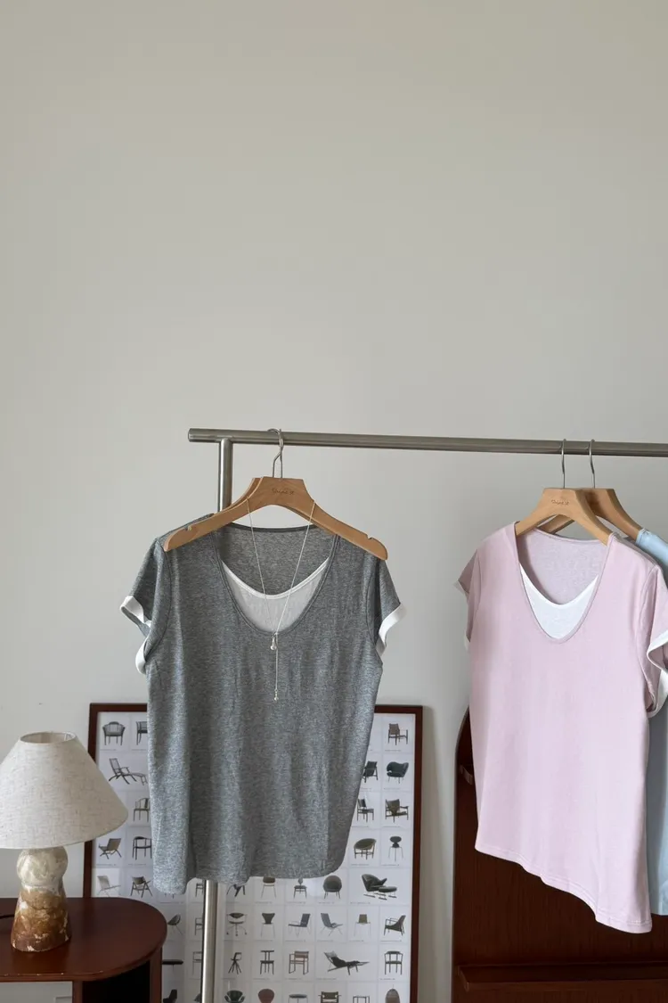 假兩件拼色棉T