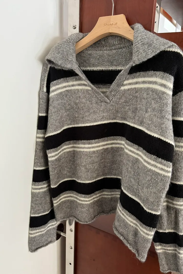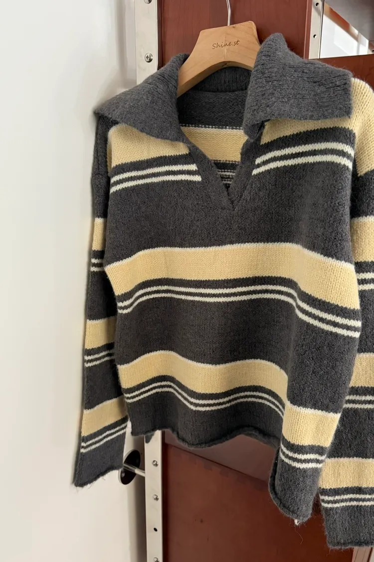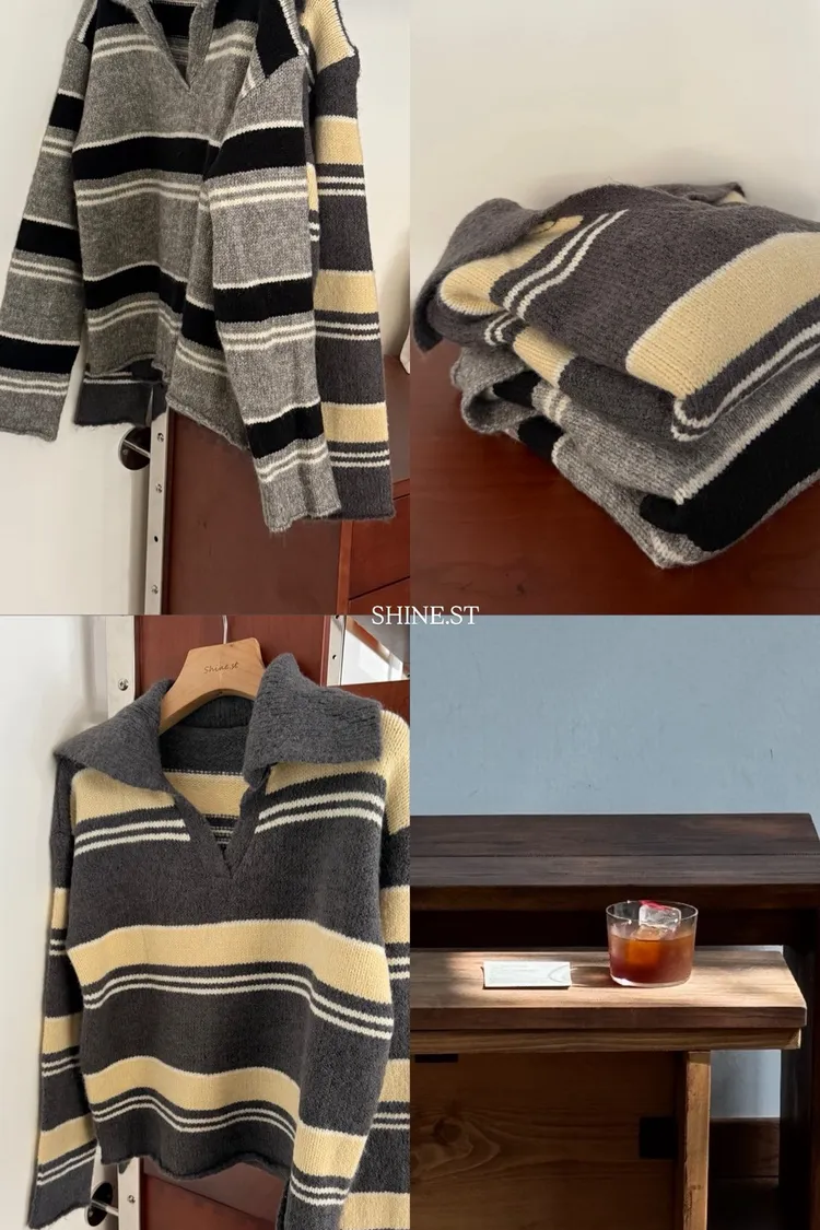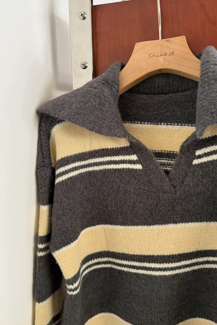 翻領小v條紋毛衣